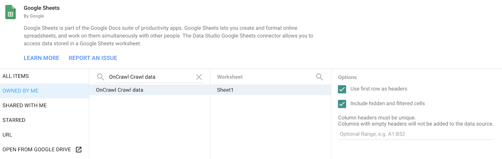 - Importez les données d’OnCrawl à travers les Google Sheets afin de pouvoir mettre à jour vos données plus tard sans reconstruire vos rapports.