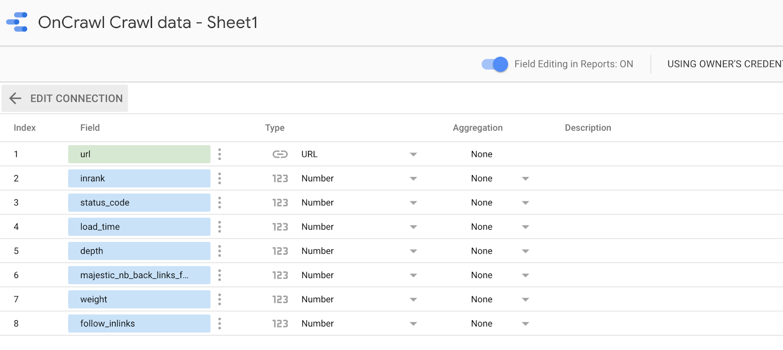 Bien que le connecteur Data Studio ne soit pas encore disponible pour OnCrawl, vous pouvez toujours utiliser n’importe quelles données de crawl dans Data Studio.