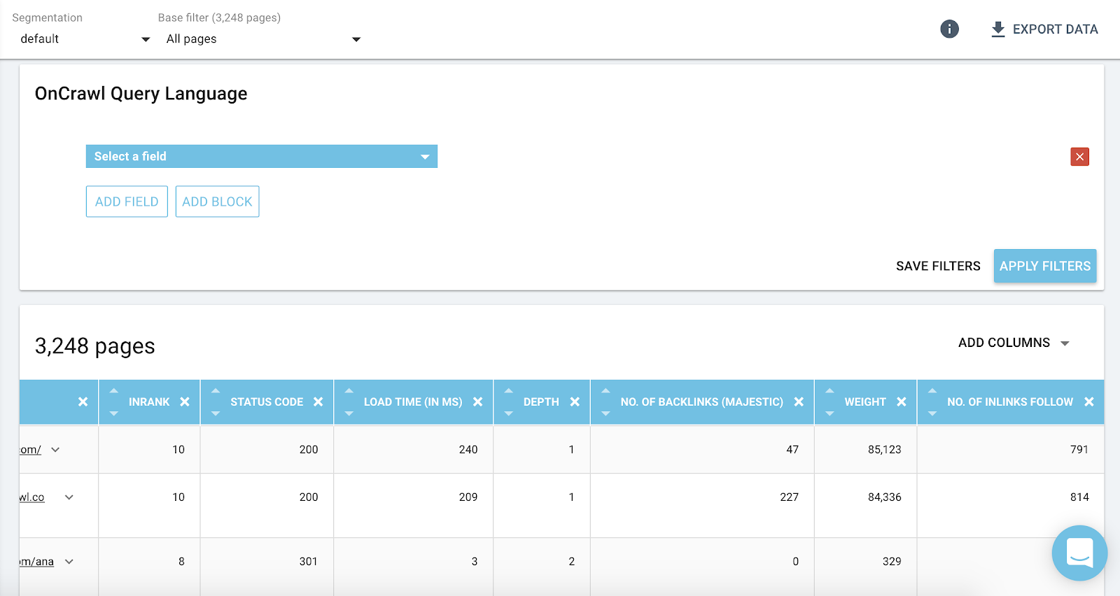 Depuis le Data Explorer d’OnCrawl, commencez par créer un rapport avec des colonnes contenant les caractéristiques que vous voudriez analyser.