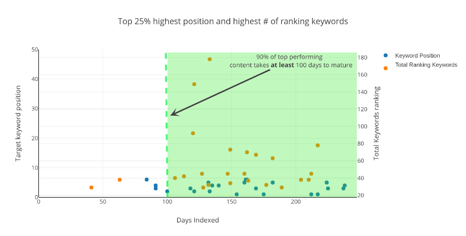 D’après les observations de Moz, il faut en moyenne 100 jours pour que les nouveaux contenus soient performants dans les classements de Google. Leur étude a montré que 25 % des articles de blog qui sont classés sur le plus de mots-clés sont indexés depuis 149 jours en moyenne. Par ailleurs, 25 % des articles qui performent le moins sont indexés depuis seulement 74 jours. Enfin, 90 % des contenus qui performent le mieux dans les SERPs ont mis au moins 100 jours pour atteindre cette position.