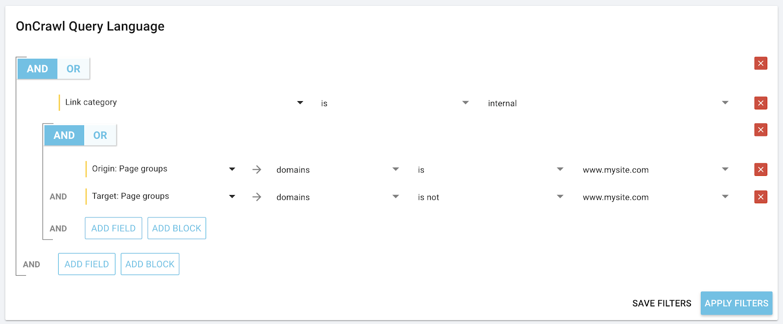 Astuce OnCrawl : Si vous disposez de liens vers les autres traductions de votre site, par exemple dans le pied de page, cela risque de produire un nombre très important de liens. Si l’ancre de texte n’est que le nom du pays, vous pouvez facilement les enlever des résultats en utilisant le caractère “|” entre les noms de pays dans chacune des langues impliquées.